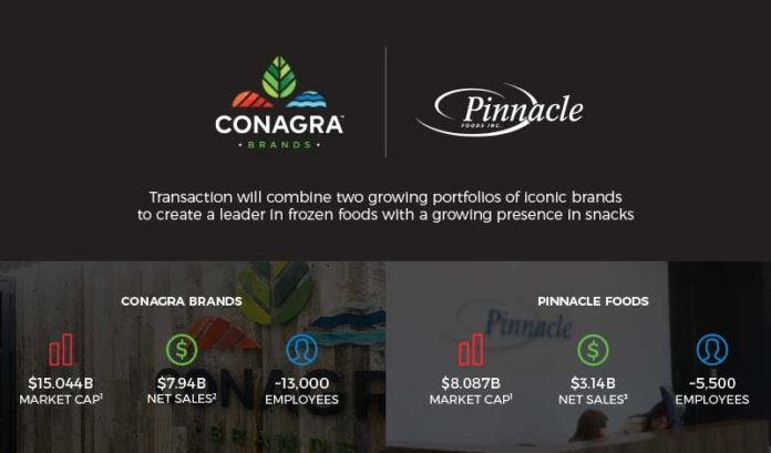 “Expanding Conagra Brands’ portfolio through the acquisition of Pinnacle Foods creates a tremendous opportunity to drive profitable growth and shareholder value by further leveraging our proven approach to innovation, brand-building, operational excellence and deep customer relationships,” Sean Connolly, CEO and president of Conagra, said in a prepared statement.