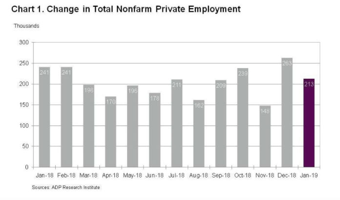 The payroll and human services company said in its monthly ADP National Employment Report that the number of jobs grew by 213,000 positions between December and January.