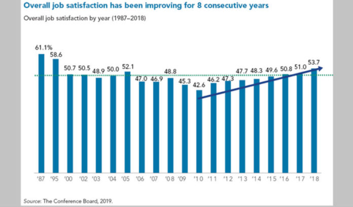 The survey of approximately 2,000 U.S. workers showed more than half (54%) are satisfied with their employment. Satisfaction is up roughly 3% when compared to last year, marking the biggest increase in the survey’s 32-year history, it said.