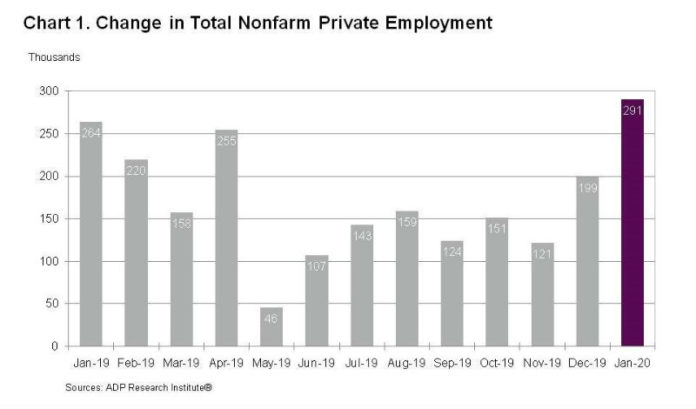 The payroll and human resources company said in a news release that the month saw a 291,000-job uptick in nonfarm private employment.