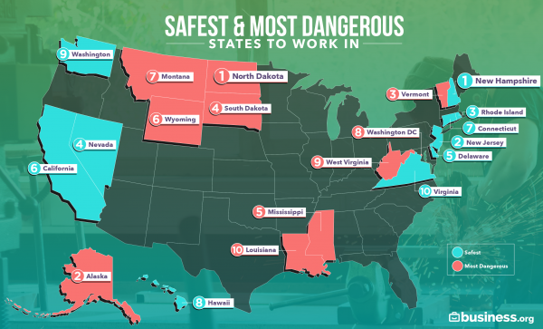 Business.org said it used BLS data to look at the number of fatal workplace injuries per 100,000 residents 18 and older (75%) with a lower value positively impacting the score. The company also factored in the percent of change from 2017 to 2017 with a lower value positively impacting the score.