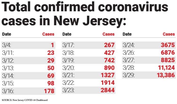 At 13,386 cases, New Jersey is second overall, well behind New York (59,313) but well ahead of Michigan (4,659), which just passed California.