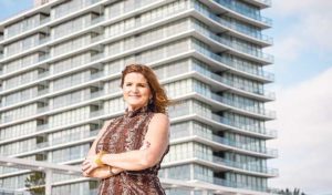 Realtor Mary McAllister, a broker and sales associate at Diane Turton, Realtors, in front of the Asbury Ocean Club, a 17-story luxury condominium and hotel in Asbury Park.