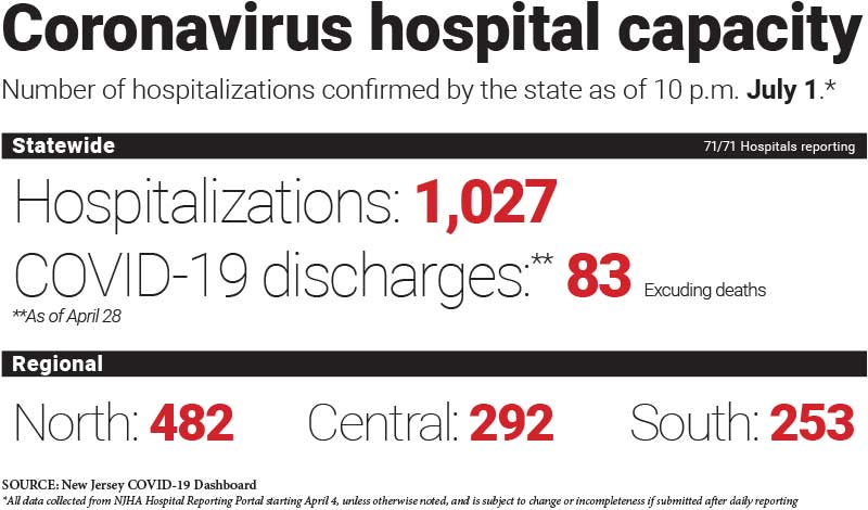 Murphy noted that, as of July 1, hospitalizations are down 12% in the past two weeks (since June 17) and down 94% since the peak. Patients in hospitals, in ICU and on ventilators are all down more than 85% since the peak.