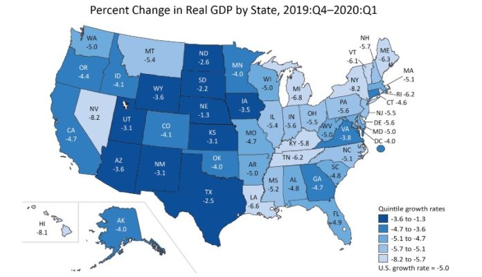 GDP also decreased in all 50 states as well as the District of Columbia, the report said. The percentage change in real GDP in the first quarter ranged from -1.3% in Nebraska to -8.2% in New York and Nevada.