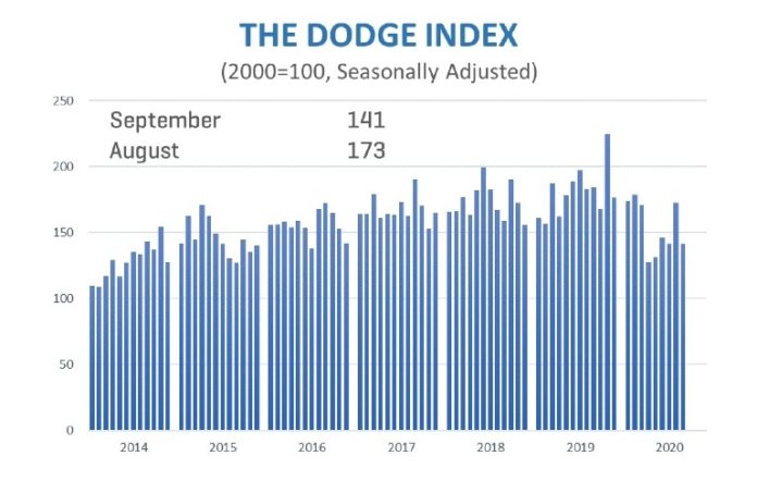 For September, the Dodge Index fell 18%, to 141, from August’s 173 level. In the index, 100 represents the year 2000.