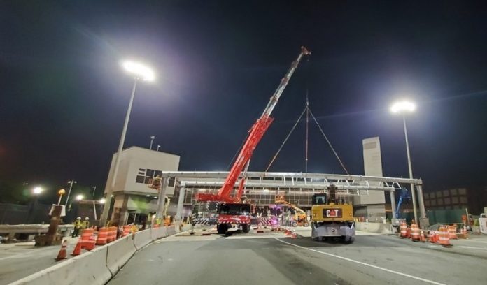 Two massive gantries housing the technology for the new toll system, each 130 feet long and weighing about 41,000 pounds, were installed over the summer about 22 feet above the roadway just ahead of the eastbound Holland Tunnel entrance (click here to watch the installation). For pedestrians in Jersey City, roadway improvements and upgraded intersections will improve street-level safety.