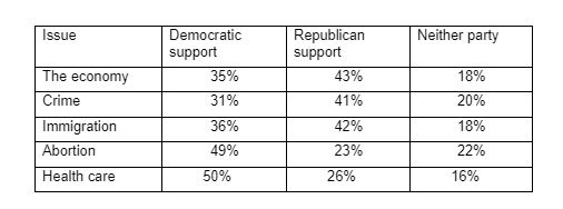 More voters said they supported the Republican positions on hot-button issues such as the economy, immigration and crime than were aligned with Democrats.