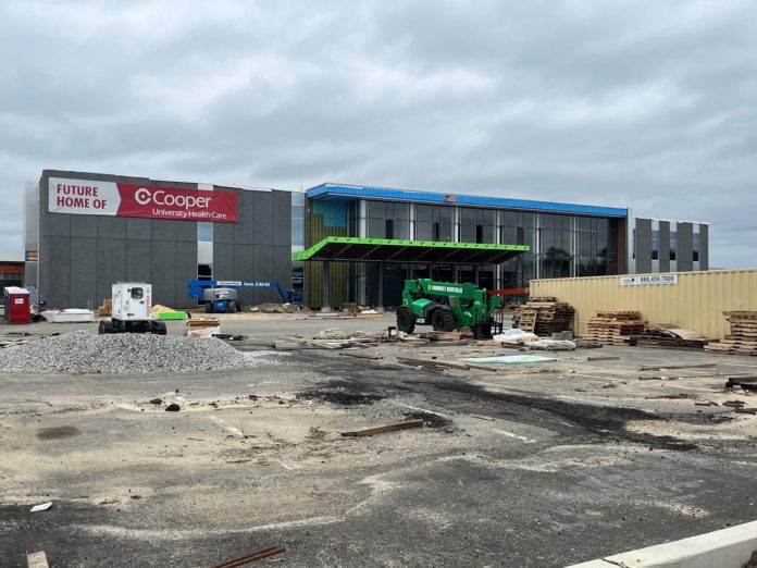 Construction continues on the 165,000-square-foot Cooper University Health Care facility as it rapidly prepares for its opening later this year; underutilized parking space on the Boscov’s side of the property continues its conversion to a 375-unit apartment complex called the Pearl by Bel Canto.