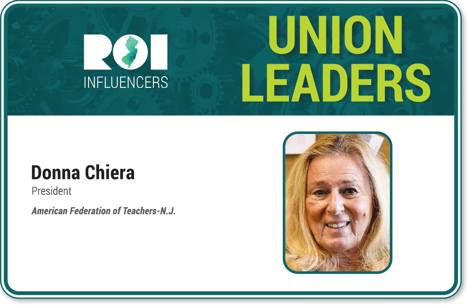 Chiera not only is president of the AFT-NJ, leading the 30,000-member education union federation, she serves as a vice president for the national organization.