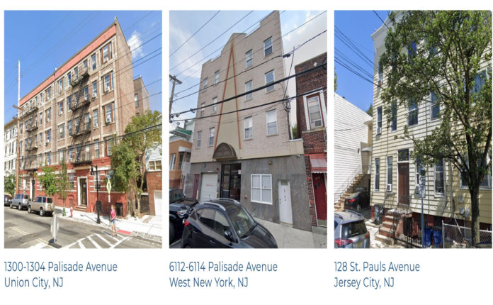 The Union City building includes 44 units — three one-bedrooms and 41 two-bedrooms. The West New York building includes 16 units — one studio, nine one-bedrooms and six two-bedrooms. The Jersey City building includes six one-bedroom units.