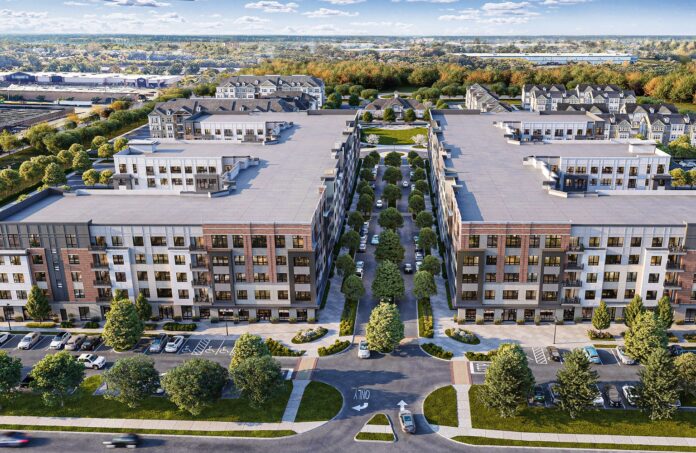 Located on Tices Lane, the highly visible, five-story midrise has passed the halfway point in its development. Upon completion, the beautifully designed, 25-acre community will include 520 sophisticated alcove studio, one-, two- and three-bedroom residences. Spacious floor plans all boast gourmet kitchens with stainless-steel appliances, luxurious bathrooms, oversized walk-in closets, an in-suite washer/dryer, resident-controlled heat/central air and remote keyless entry.