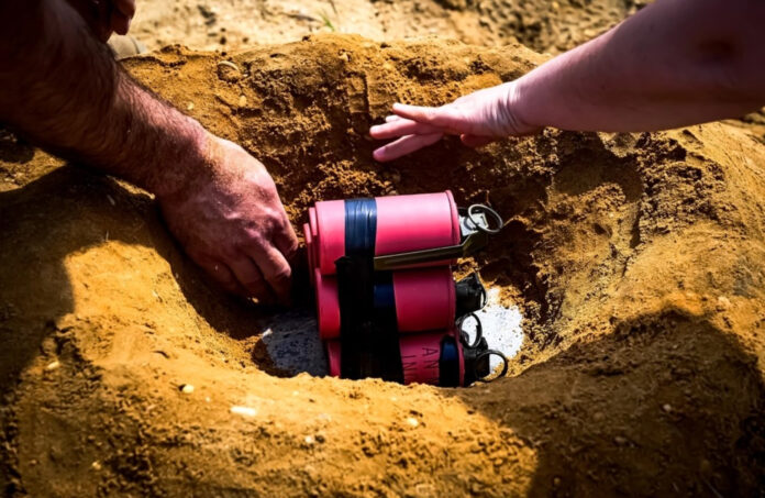 To begin the exercise, a replica anti-tank mine (with no explosive capability) is buried in the ground just as it might be found in a battle theater or on a roadside in hostile territory. The first thing EOD would do is render the fuse inoperative. How they do this depends on the type of mine it is.