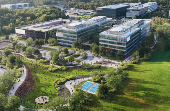 “New Veron Equities is thrilled to complete the acquisition of 310 and 315 Health Plaza and to unveil our ambitious plan to redefine a sprawling pharma complex and reinvent the suburban workplace as a cutting-edge campus,” Peter Gilpatric, who founded New Vernon Equities in 2019 with Michael Mackessy and Mike Petillo, said. “Arena will be a place where diverse companies converge to collaborate. Workspaces will seamlessly blend with lush outdoor lounges, and employees will enjoy vibrant amenities designed to inspire innovation and connection.”