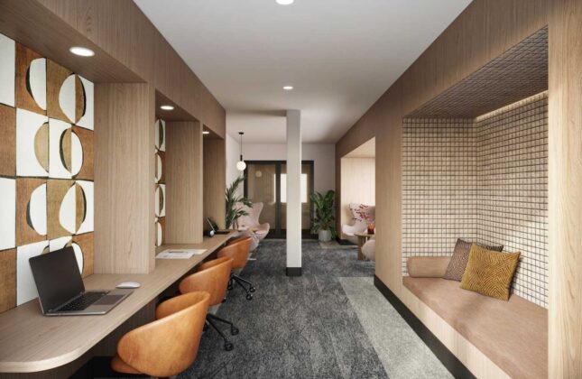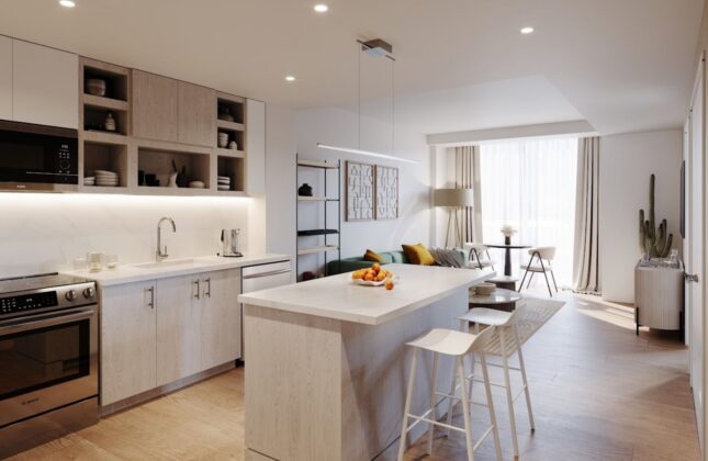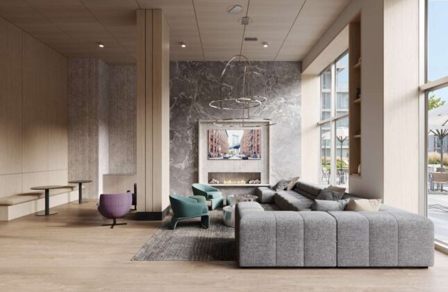 The building offers nearly 40,000-square feet of indoor and outdoor amenities. Highlights include a resort-style swimming pool, landscaped courtyard with lounge seating and outdoor games, grilling stations, and a rooftop entertainment lounge with a demonstration kitchen. Indoor amenities include a coworking lounge, private work pods, a fitness center with strength training room, resident lounges and a game room with billiards.