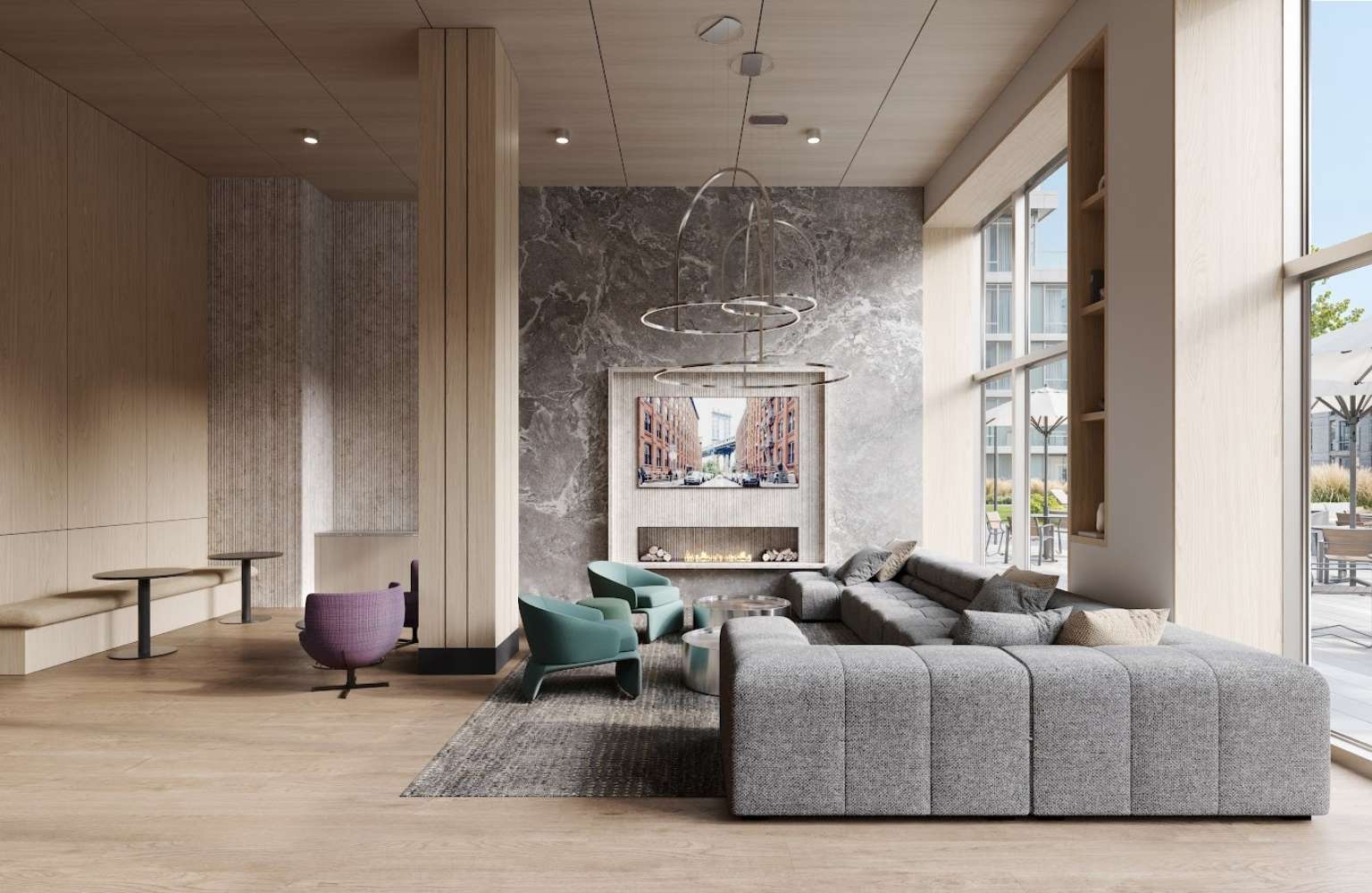 Apartments range from studios to two-bedroom-plus-den layouts. Units feature high ceilings, floor-to-ceiling windows, smart technology, custom closets, in-unit washers and dryers, and high-end finishes such as wide-plank flooring, quartz countertops and stainless steel appliances. Select residences include private outdoor space in the form of balconies, patios or terraces.