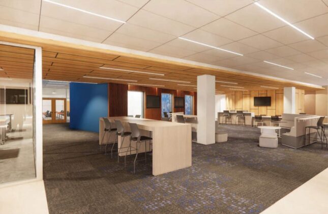 The Innovation Hub will feature a glass-walled entry along Seton Drive with an open staircase connecting the space to the second floor of the library, making the space more visible and accessible to the university community. The new facility will include: an open study lounge; technology consultation rooms; a Maker Studio for hands-on technology projects; an XR/AI Studio for exploratory learning; and dedicated content creation spaces, including a Recording Studio and three Podcast Studios.