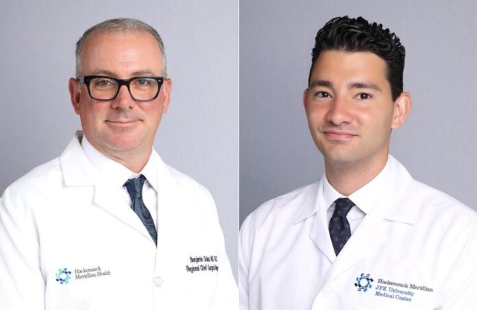Hackensack Meridian Central Region Surgical Oncology Chief Benjamin Golas and Eric Pletcher, surgical oncologist at JFK, who along with a specially trained multidisciplinary team, recently performed this procedure. The aerosol-based approach to delivering chemotherapy through the PIPAC method is more targeted than systemic chemotherapy.